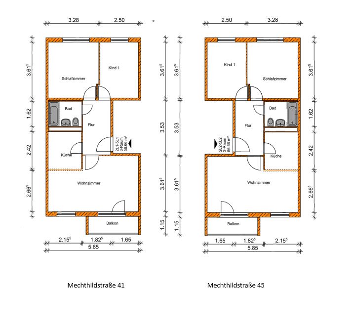 jeweils 3-Zimmer-Wohnung, 3. Etage, 56,80 m²