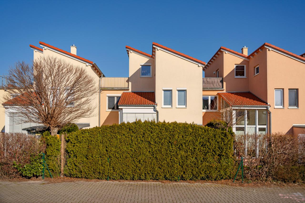 Zum Verkauf steht ein vermietetes Reihenmittelhaus in individueller und ansprechender Architektur mit zeitgemäßem, modernem Grundriss. Die Immobilie befindet sich in einer gewachsenen und grünen Einfamilienhaussiedlung und ist Teil einer Wohneigentumsanalage. Sie erwerben somit ein Reihenhaus als Alleineigentum mit einem Anteil von 1/5 am Gemeinschaftseigentum. Der Verkauf erfolgt lastenfrei (alt- u. baulastenfrei).